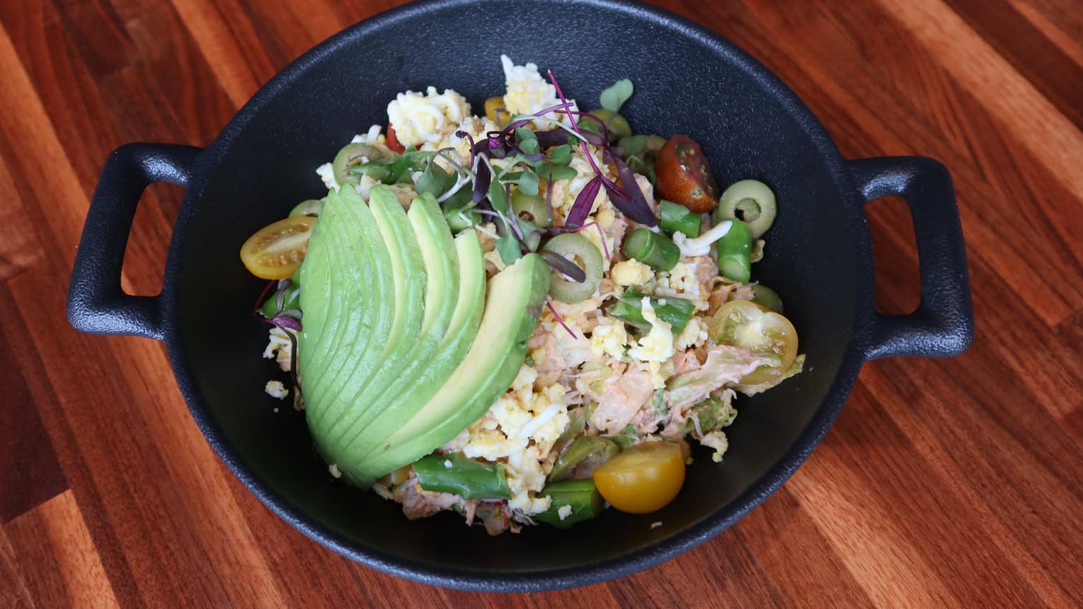 SAN FRANCISCO BRUNCH LOUIETwo farm-fresh poached eggs paired with Dungeness crab, baby gem lettuce, asparagus, tomato, scallion and olives, tossed in classic Louie dressing.