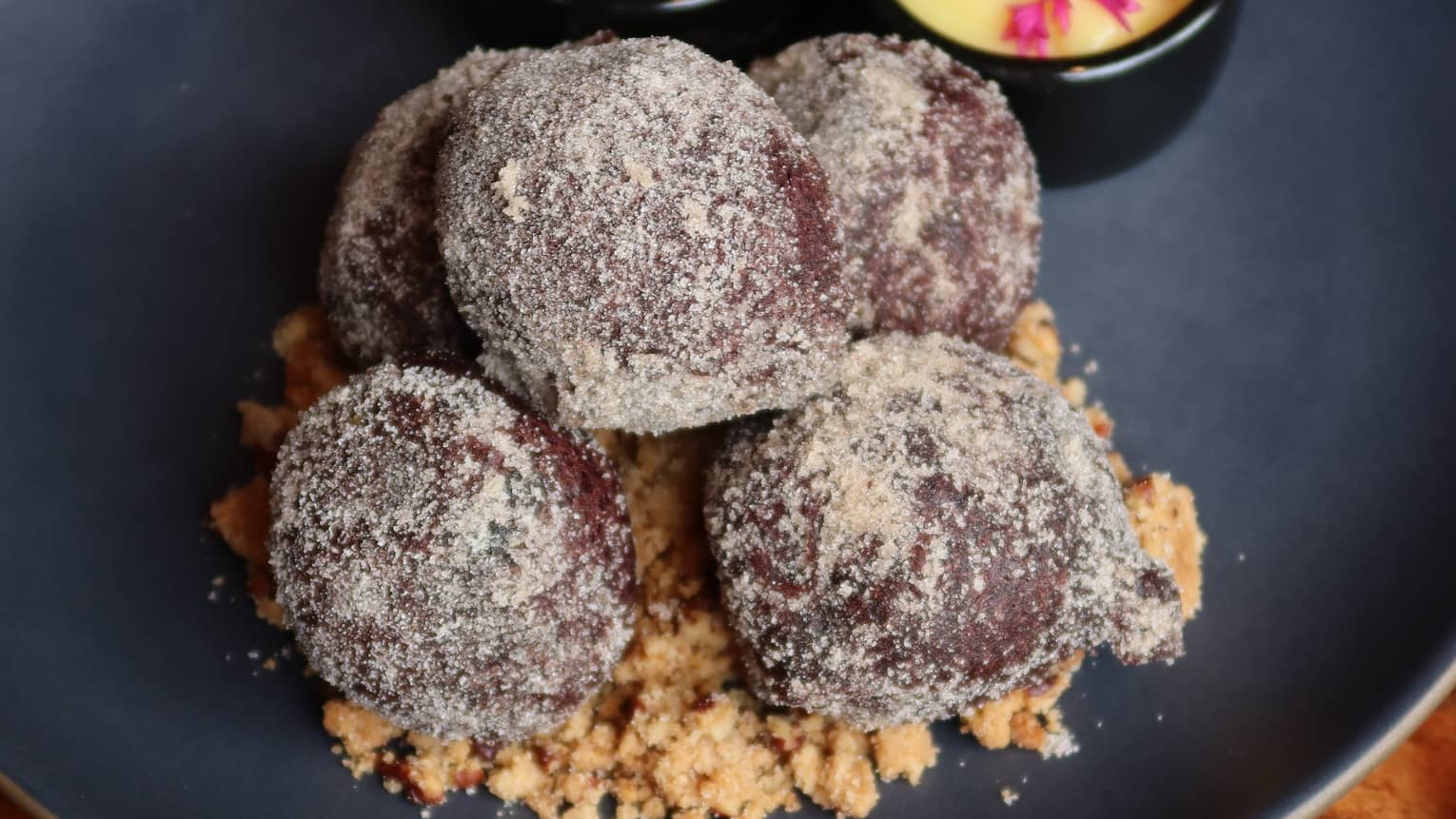 UBE RICOTTA DONUTSLight, airy donuts dusted in cinnamon sugar, served with bright calamansi curd, toasted coconut anglaise, and a salted pecan streusel crunch.
