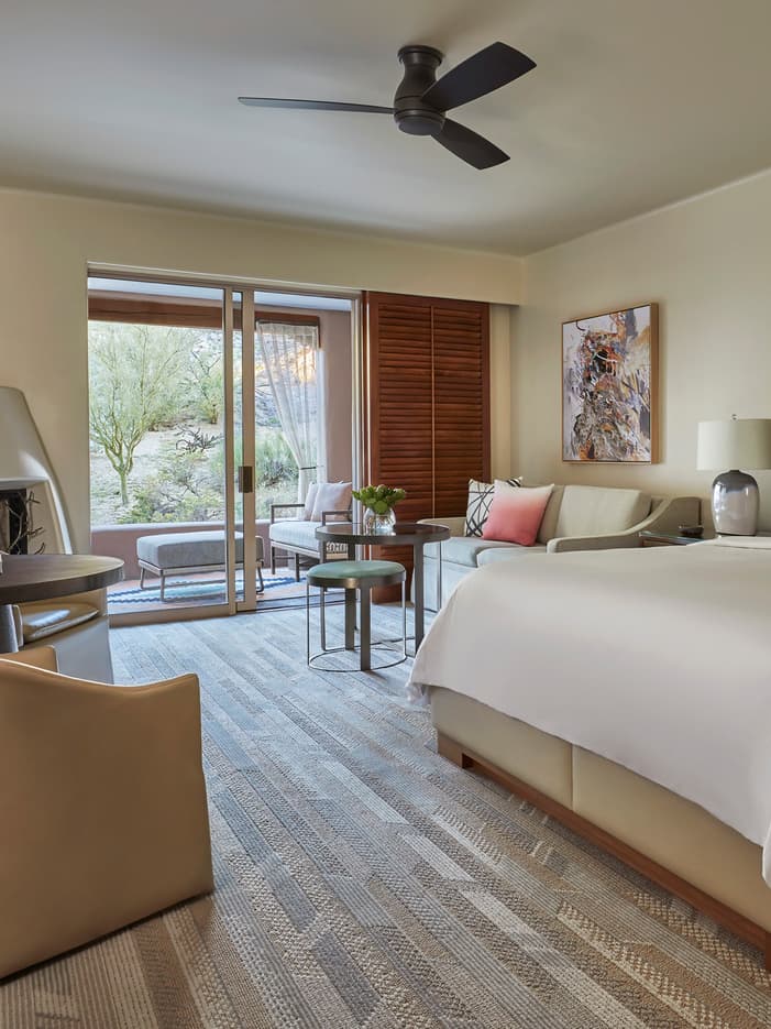 Soak up Scottsdale’s more than 330 days of sunshine from your spacious outdoor patio, fully furnished and complete with a flat-screen television. Step in from your private patio or balcony overlooking the Sonoran Desert and relax in the spacious guest room with a gas-burning fireplace. A newly enhanced bathroom features a deep soaking tub and luxurious separate shower.