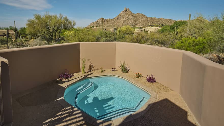 Tucked into the desert landscape, this suite offers a private plunge pool, beehive fireplace and outdoor patio – the essence of Four Seasons Scottsdale plunge pool suites.