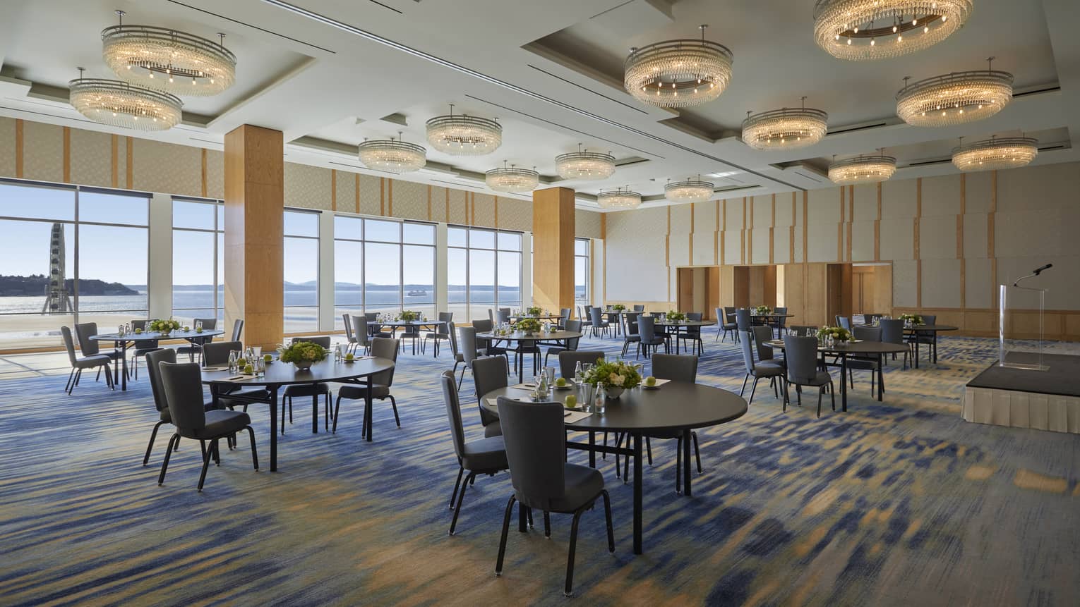 Complement your meeting or special event with ample sunlight or a starlit night from a wall of floor-to-ceiling windows. This elegant, expansive space is framed by dramatic views of Elliott Bay, Puget Sound and the Olympic Mountains.