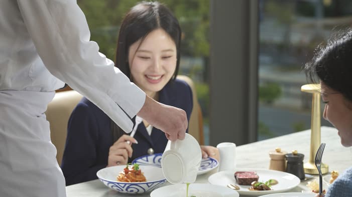 The interior design harmoniously blends the green tones of Korean celadon with earthy hues accented by silk and ceramic details. This elegant composition brings Korea’s traditional beauty into a contemporary setting and reveals Seoul’s cultural depth throughout the space.