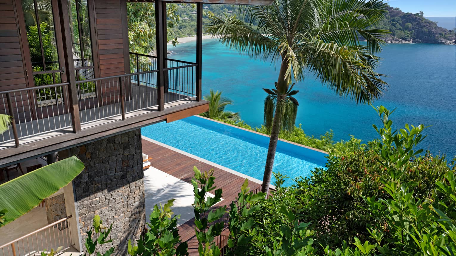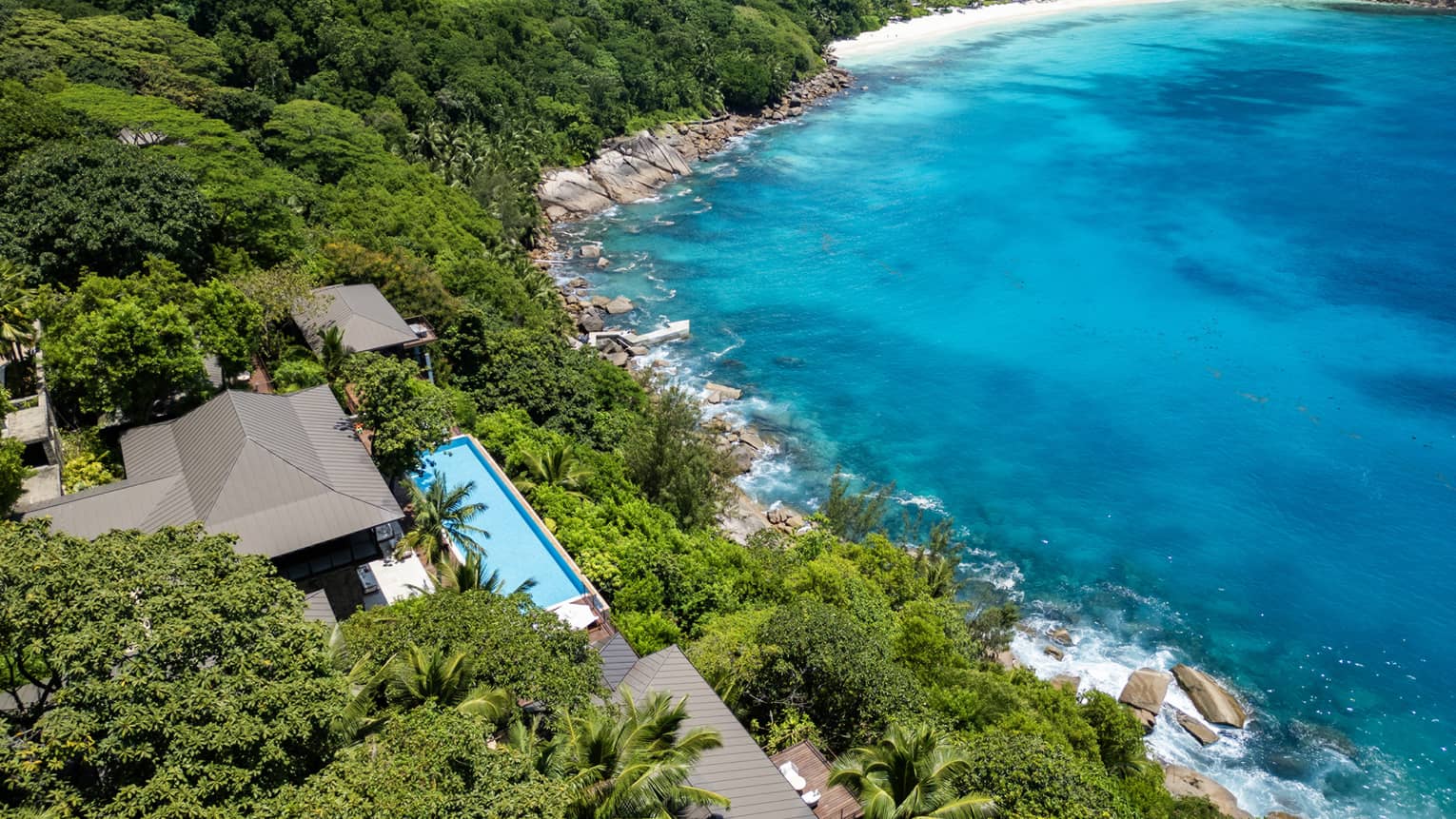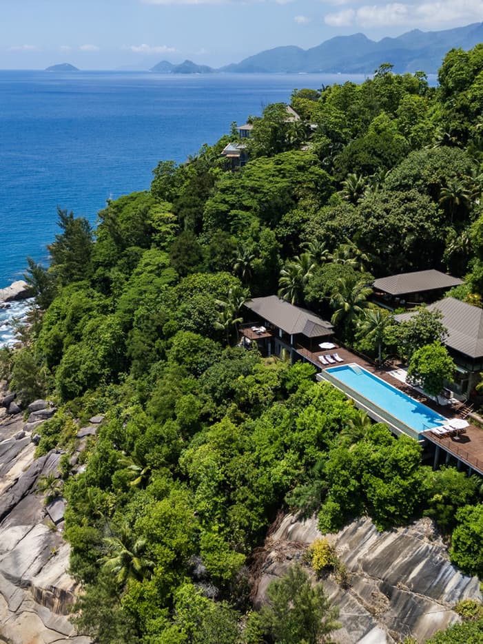 With panoramic views of Petite Anse bay and perfect for multi-generational families, this dramatic multi-level residence villa is perched on a private and commanding cliffside location. All bedrooms overlook the turquoise waters of the Indian Ocean and are steps away from the spectacular infinity pool, kitchen and light-filled living room which sits at the heart of the villa, surrounded by swaying palms. Imagine flawlessly prepared meals by your very own chef or sharing ocean-view sunset drinks on the deck, backed by the sounds of the sea.