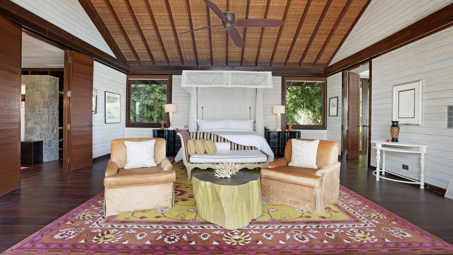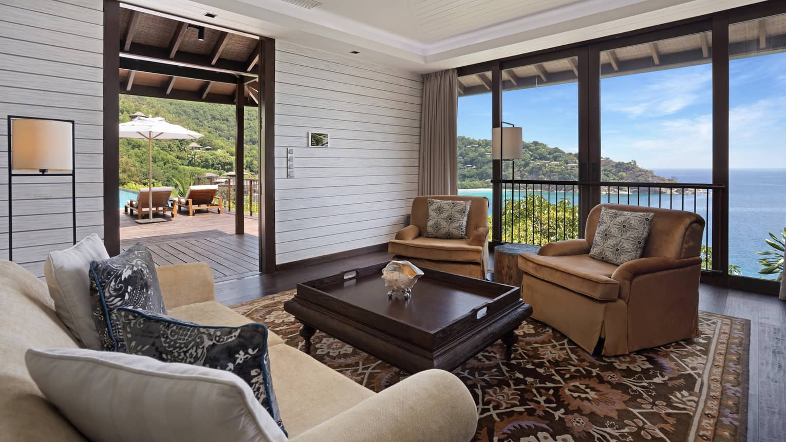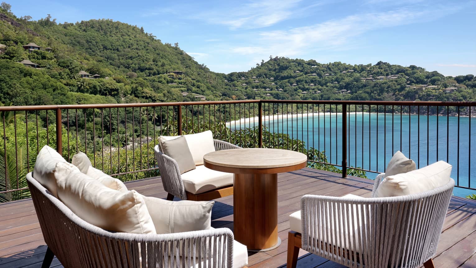 With panoramic views of Petite Anse bay and perfect for multi-generational families, this dramatic multi-level residence villa is perched on a private and commanding cliffside location. All bedrooms overlook the turquoise waters of the Indian Ocean and are steps away from the spectacular infinity pool, kitchen and light-filled living room which sits at the heart of the villa, surrounded by swaying palms. Imagine flawlessly prepared meals by your very own chef or sharing ocean-view sunset drinks on the deck, backed by the sounds of the sea.