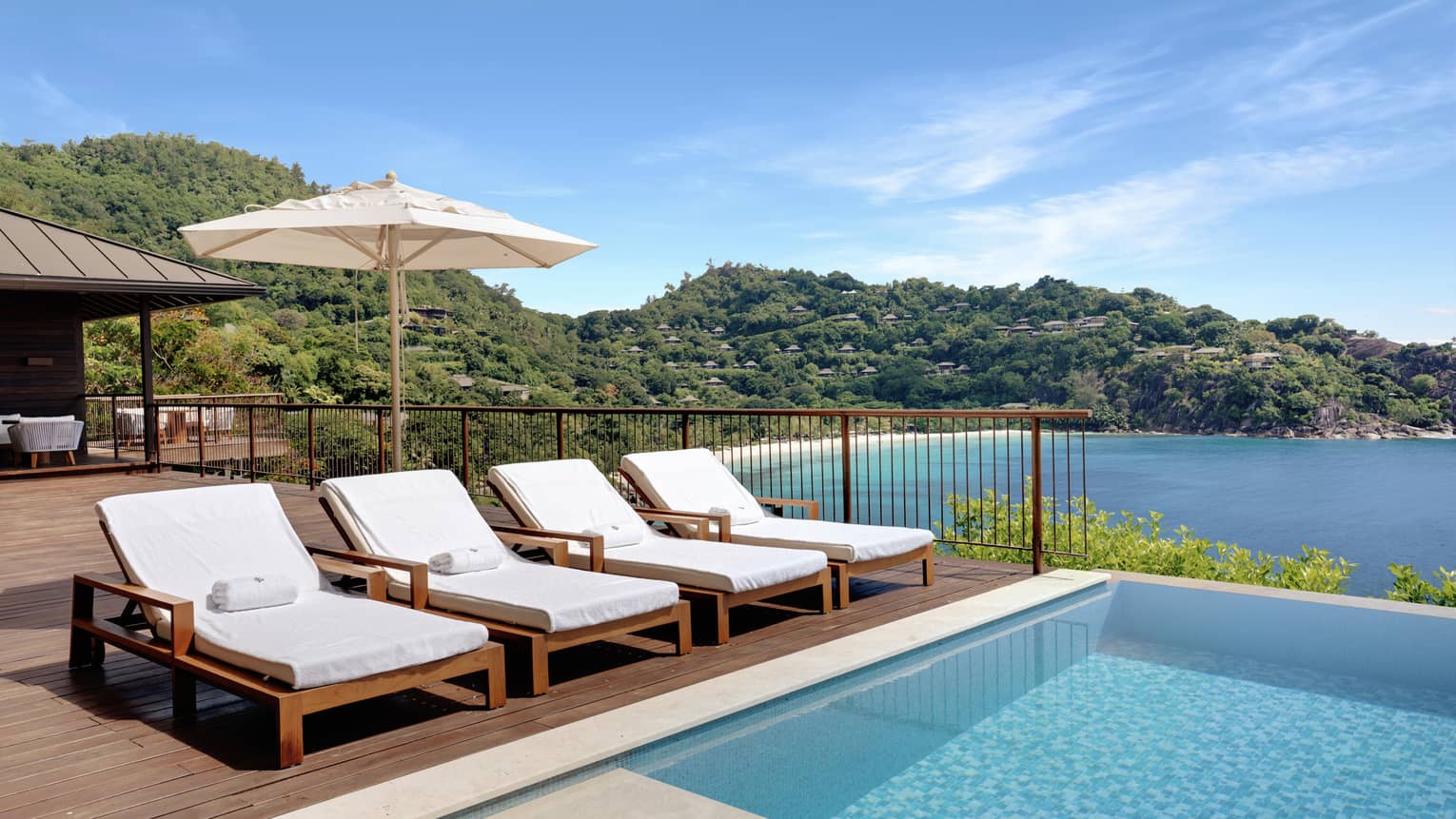 - Poolside sundeck with sunbeds