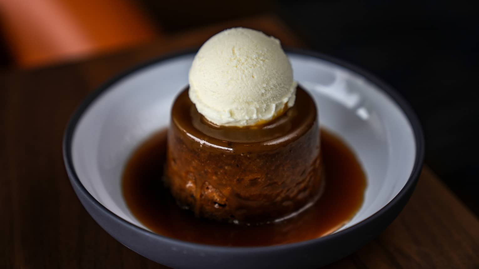 Sticky Toffee PuddingRich pudding drizzled with caramel sauce and topped with vanilla ice cream.