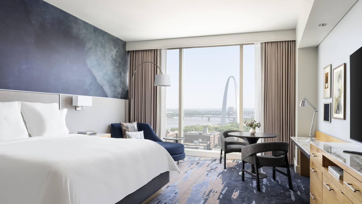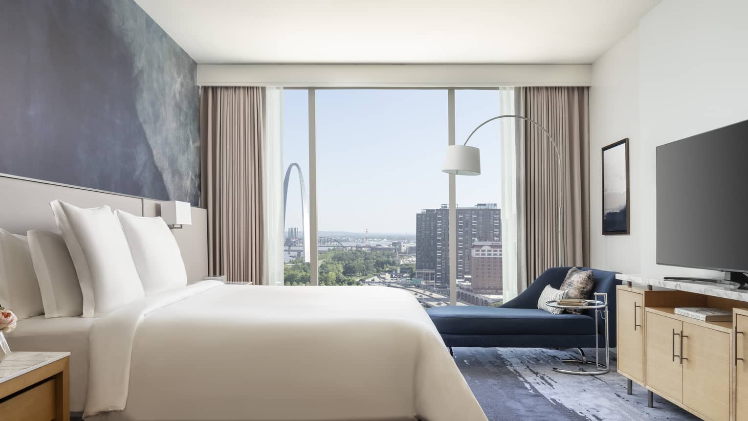 A king-size bed overlooks the Gateway Arch in an Arch-View Room