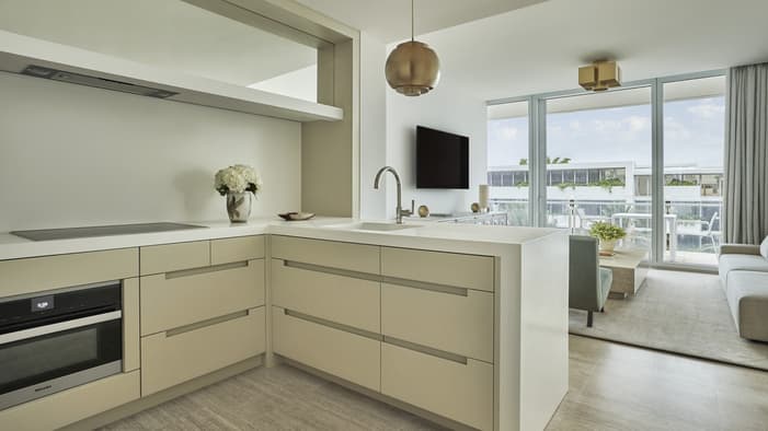 Perfect for extended stays and private entertaining, Residential Suites offer all the trappings of home, such as fully equipped kitchens, luxurious living areas and private balconies that look out across the Atlantic Ocean or city skyline, with Miami Beach just a short drive away.