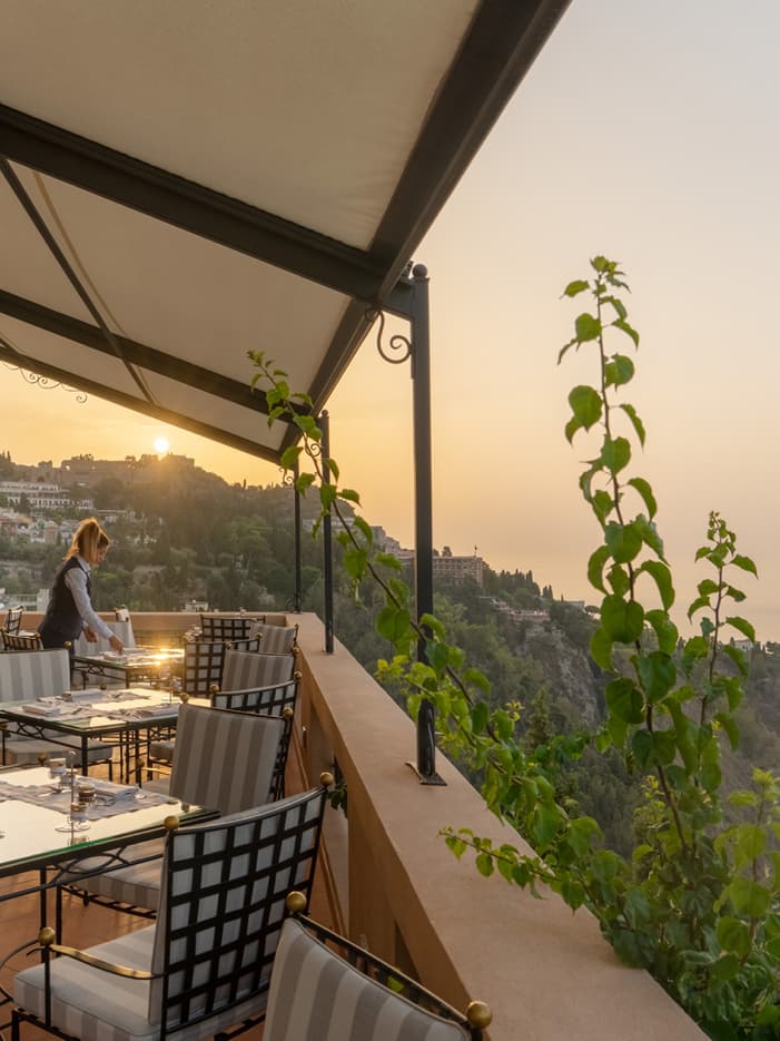 Savour your mornings with Sicilian delicacies and revisited international classic dishes. Breakfast is served at our bright restaurant or on our iconic terrace with breathtaking views of Mount Etna, Taormina Bay and the Ancient Theatre.