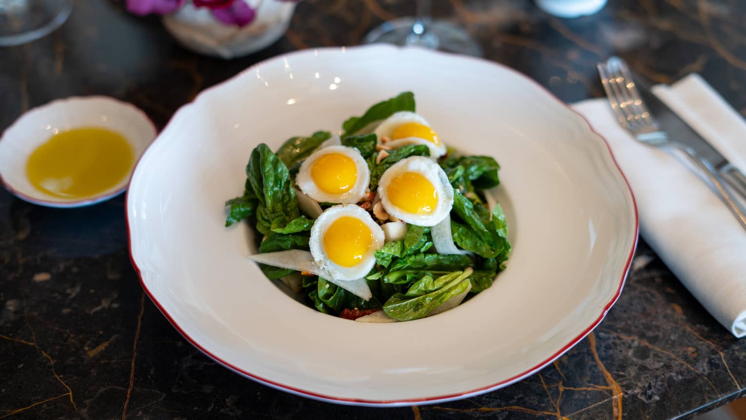 Modicana SaladSpinach, Hazelnuts, Quail Egg, Avocado, Conference Pears, Semi-Dried Tomatoes