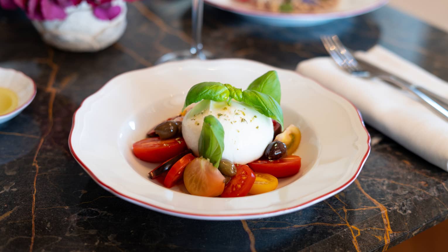 Burrata CampanaCreamy Burrata Cheese from the Campania region, Cherry Tomatoes, Taggiasca Olives, Fresh Basil
