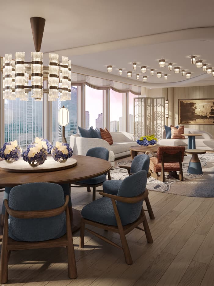 On the top floor of the Hotel, the Tokyo Manor Suite captures the elegance of a private residence in the capital. A spacious living room with a dining table for eight, an oversized sofa and a wall-mounted TV creates the perfect setting for home-style meals or relaxed evenings, while floor-to-ceiling windows frame views of Tokyo Station and the lively Marunouchi district below. For couples or family stays, the suite can be connected to the Eki Room. For more information, please contact the Hotel.