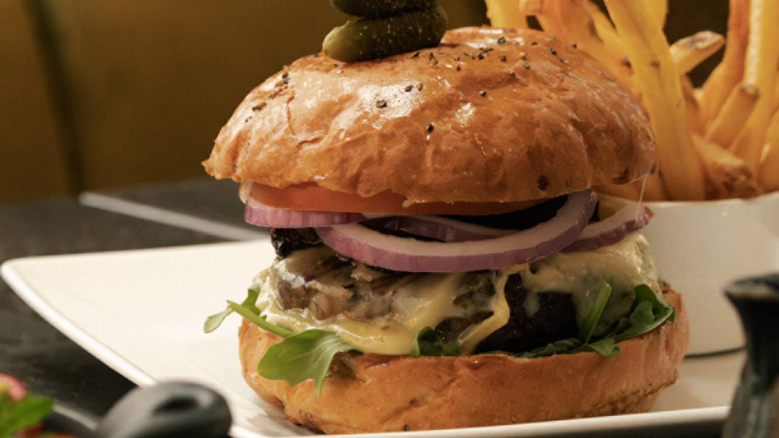Wagyu Beef Patty, Tomato, Red Onion, Pork Belly, Raclette, Cornichons, Magic Sauce