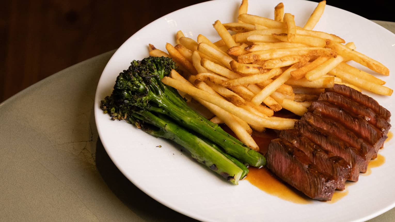 Grilled Ontario Beef Flat Iron Steak | Frites (8 oz.)Peppercorn Sauce, Sautéed Broccolini, Fries