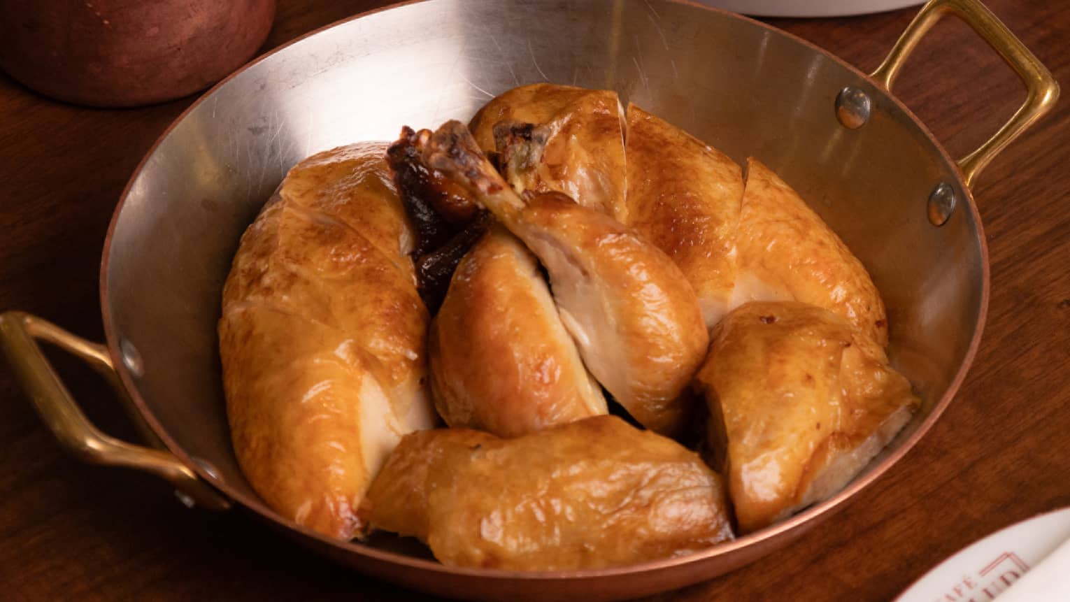 Poulet à la CrèmeWhole Rotisserie Chicken, Morel Mushroom Cream Sauce, Grilled Asparagus, Béarnaise Mousseline, Spring Baby Green Salad