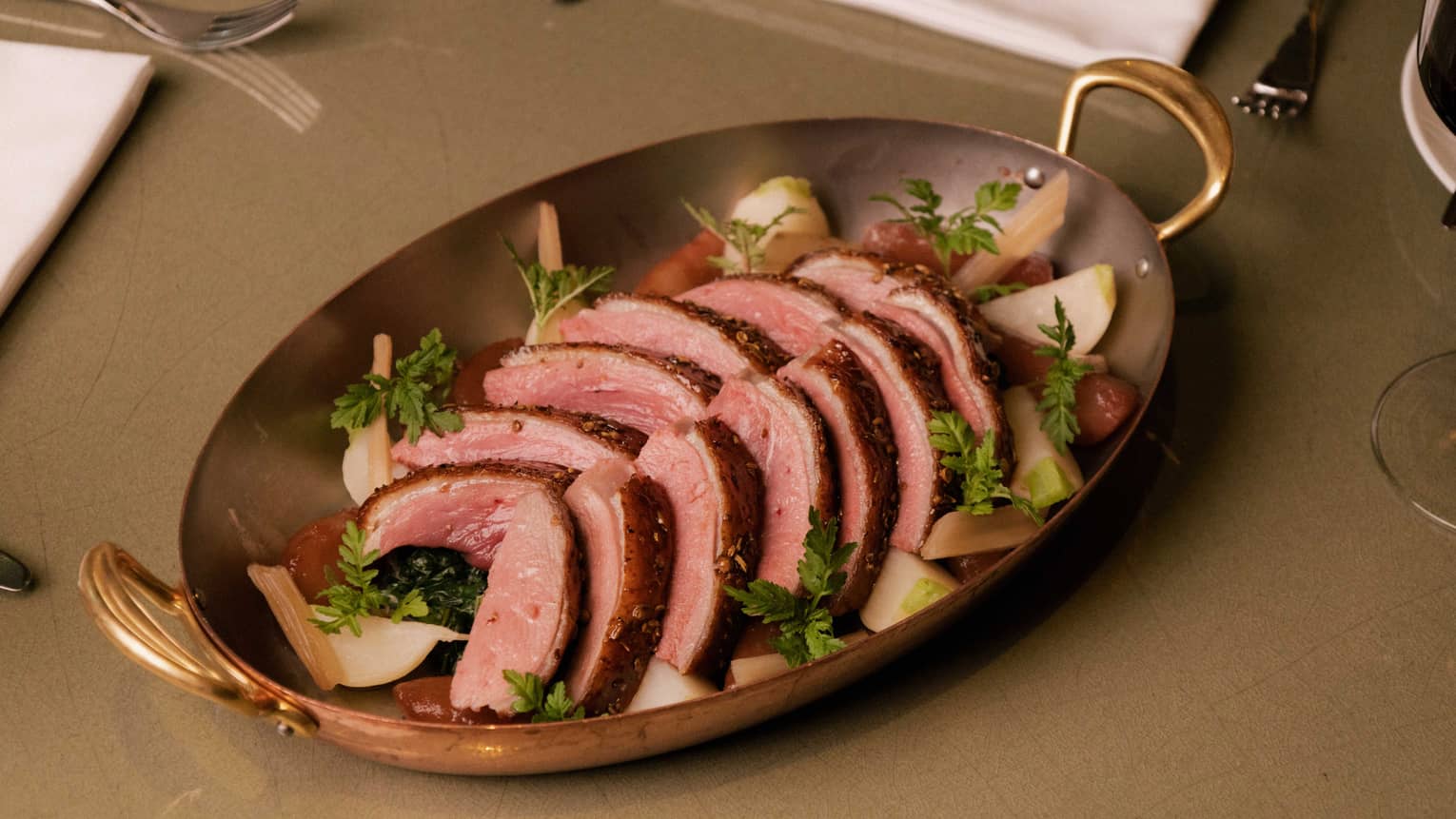 Canard RôtiRotisserie Duck Breast, Crispy Duck Confit, Delicata Squash, Bitter Greens, Heirloom Beetroots, Sauce Albufera