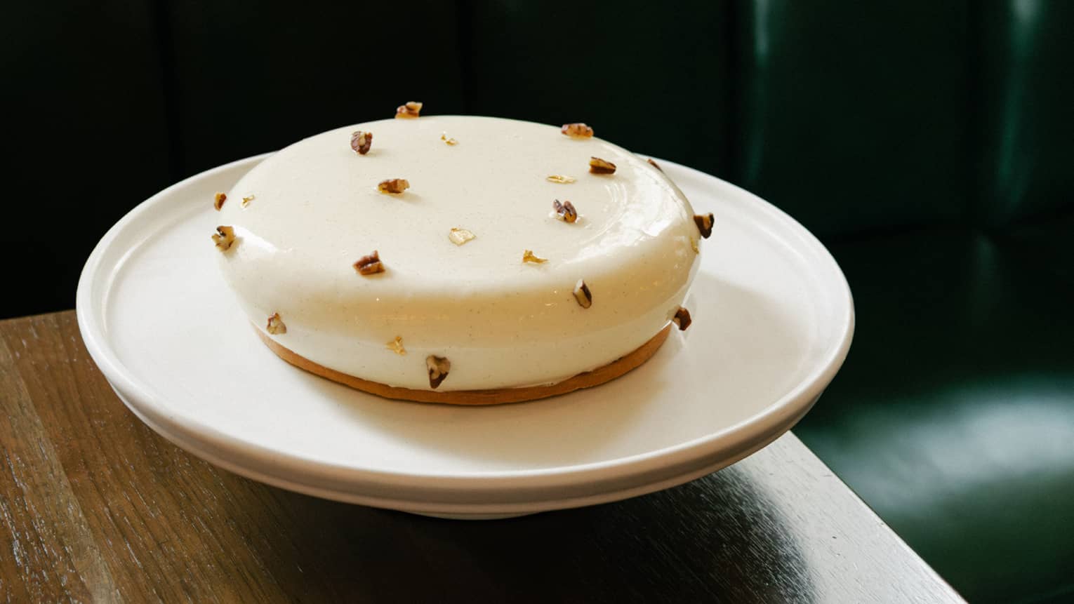 Pecan and Banana GâteauPecan Sponge, Banana Compote, Passion Fruit Crémeux, Vanilla Mousse