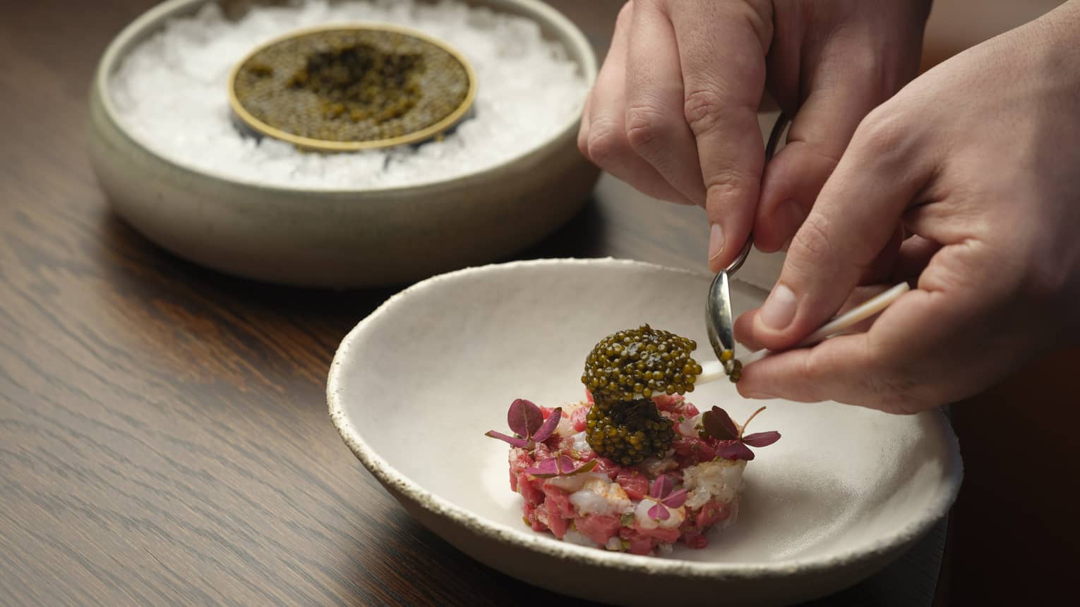Belted Galaway Beef Steak TartareSmoked Scallop, Maison Kaviari
