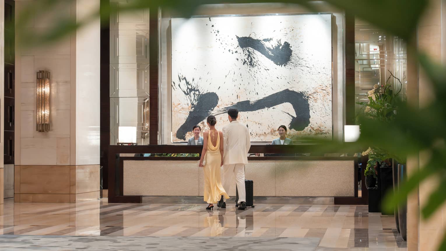酒店前台后方的大型抽象艺术佳作诚迎您的光临