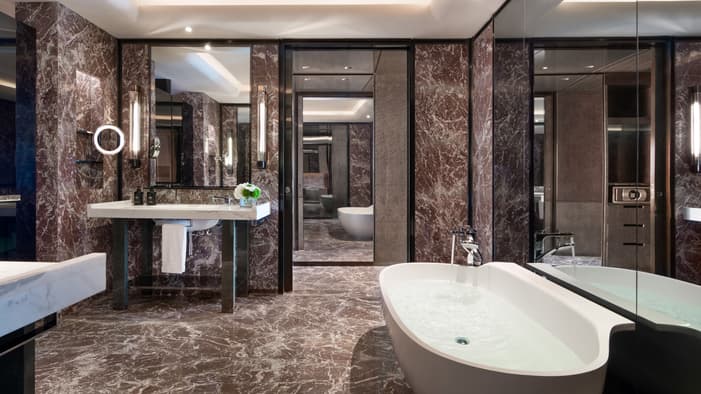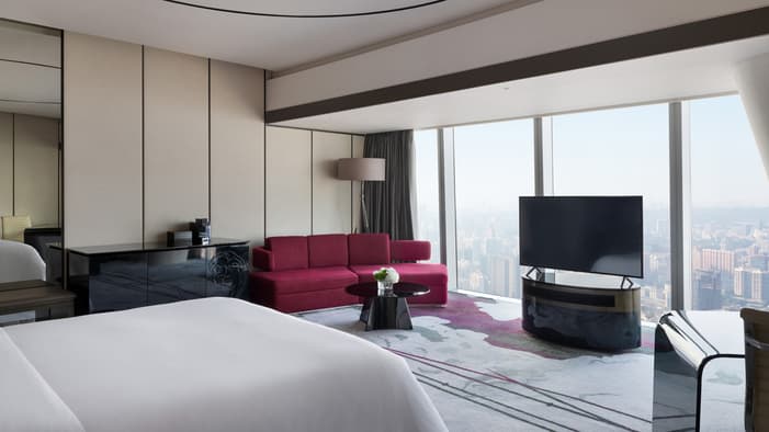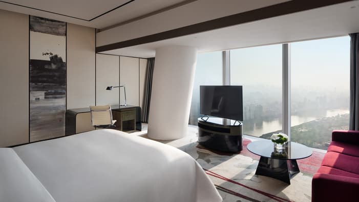 客房内融入现代亚洲风格的设计,均设有落地窗及宽敞的大理石浴室。透过落地窗幕,可欣赏珠江两岸及城市天际线的繁华景致。