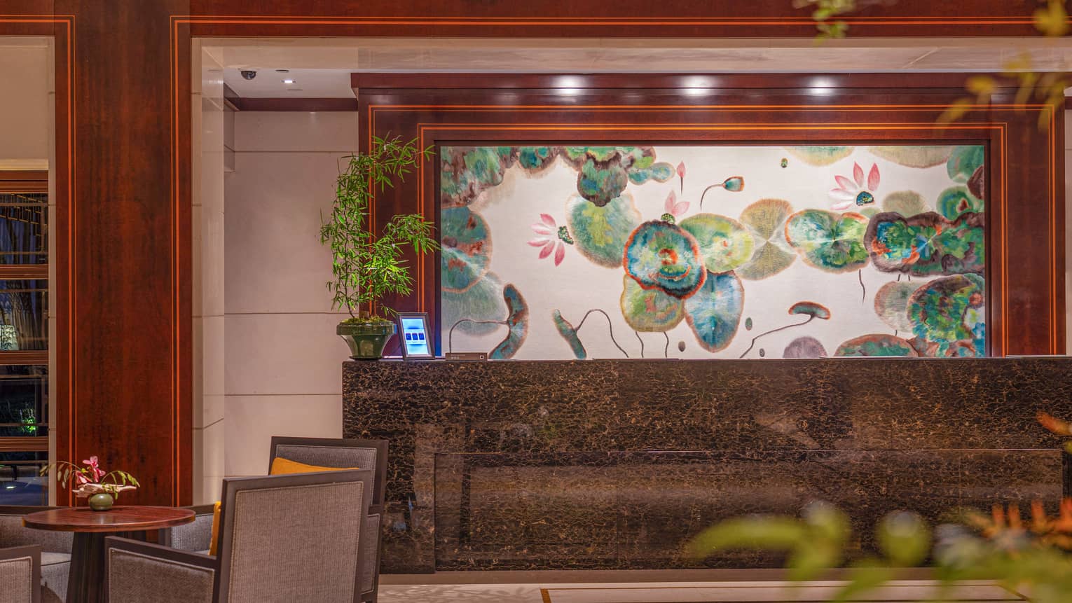 以大堂中的深色木饰与苏绣艺术品诚迎您的光临