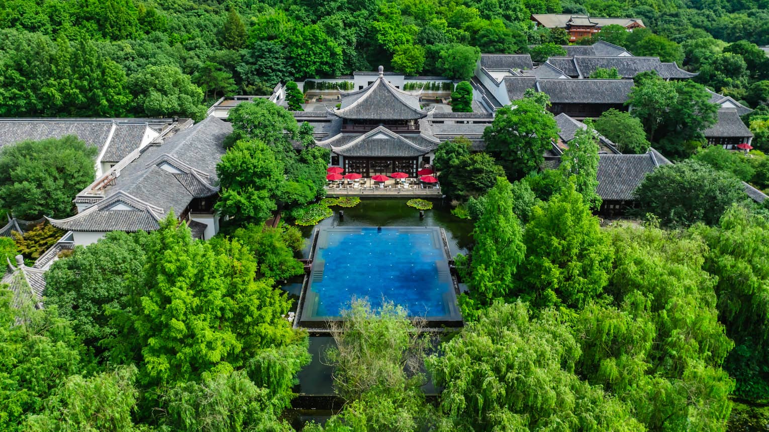 郁郁葱葱的花园掩映着这片宜人之地。您可以在池畔一边喝着清爽饮品,一边静看风景如画的西湖,尽情沉醉于此时此刻、此情此景。