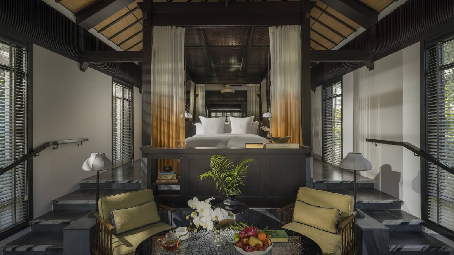 加高的睡眠和沐浴区笼罩在薄纱幔帐内