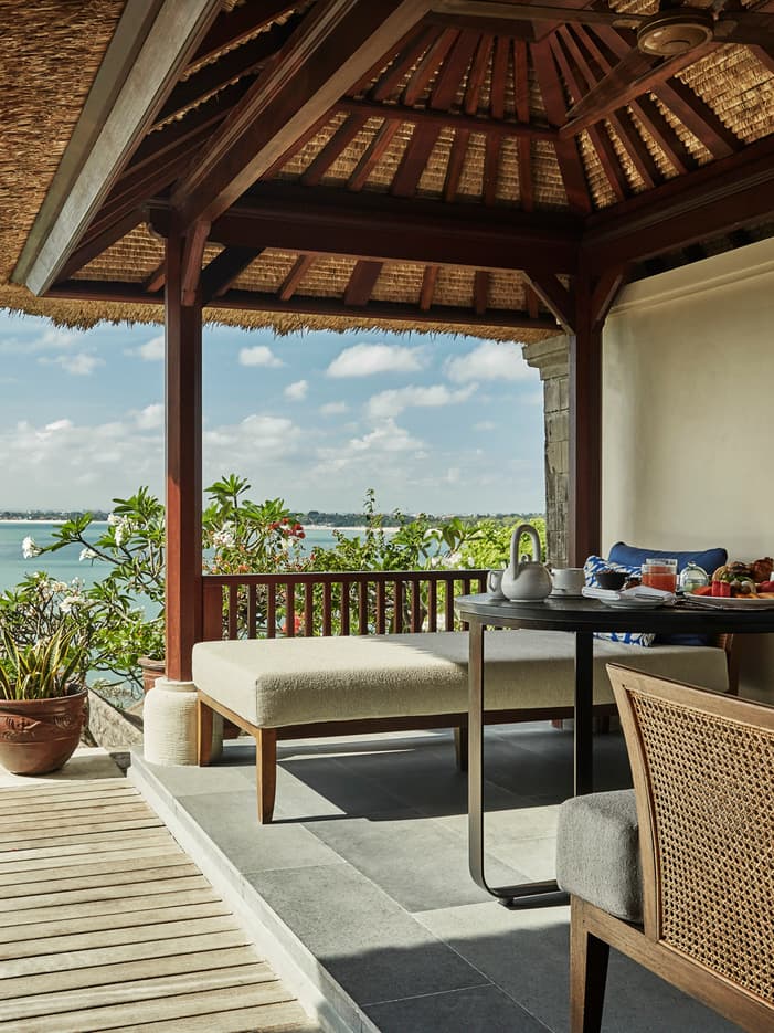 茅草覆顶的休息、沐浴与起居、用餐凉亭根据经典的巴厘岛庭院房屋风格设计,私密的围墙花园将其包围,形成一片私密的天地