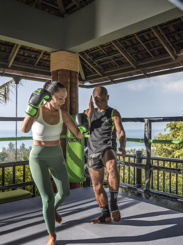 身在泰国,何不探索一番令人着迷的泰拳传统?我们的专业级露天拳击训练台坐落在俯瞰泰国湾的山坡上,欢迎您在此参加由专业拳手执教的泰拳课程(多种定制课程分别适合不同年龄段和不同能力水平的学员),加入新手训练营,或者随心所愿地自行练习。
