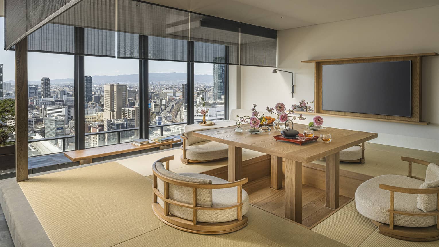 来到我们的现代日式旅馆楼层 GENSUI 玄水层,下榻酒店最宽敞的日式套房。在门口脱下鞋履,轻盈迈入开阔的居停空间,沉浸于现代日式旅馆氛围中。套房设有一张下沉式四人餐桌和一张宽大舒适的靠窗日光榻,大阪的壮丽景致透过窗户映入眼帘。沐浴时,浴缸前的景致如画卷般在您眼前展开,令人倍感放松。就寝时,奢华柔软的传统日式榻榻米床铺与和纸装饰的床头板共同构筑了一方安宁舒适的休憩空间,帮助您悠然沉入甜美梦乡。