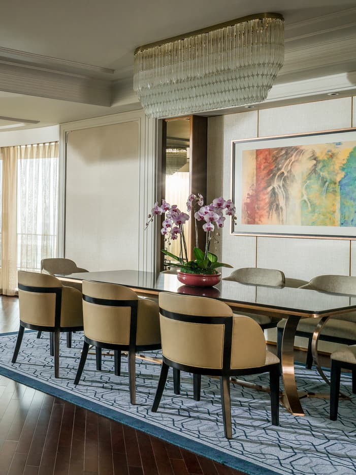 三卧室总统套房位于酒店 18 和 19 层,雄踞于路氹金光大道之上,面积达 314 平方米(3,378 平方英尺),在提供尊贵舒适体验的同时,更拥有高度的私密性。套房内设有气派非凡的门厅、宽敞起居室、休闲区、备餐室和八人餐厅。