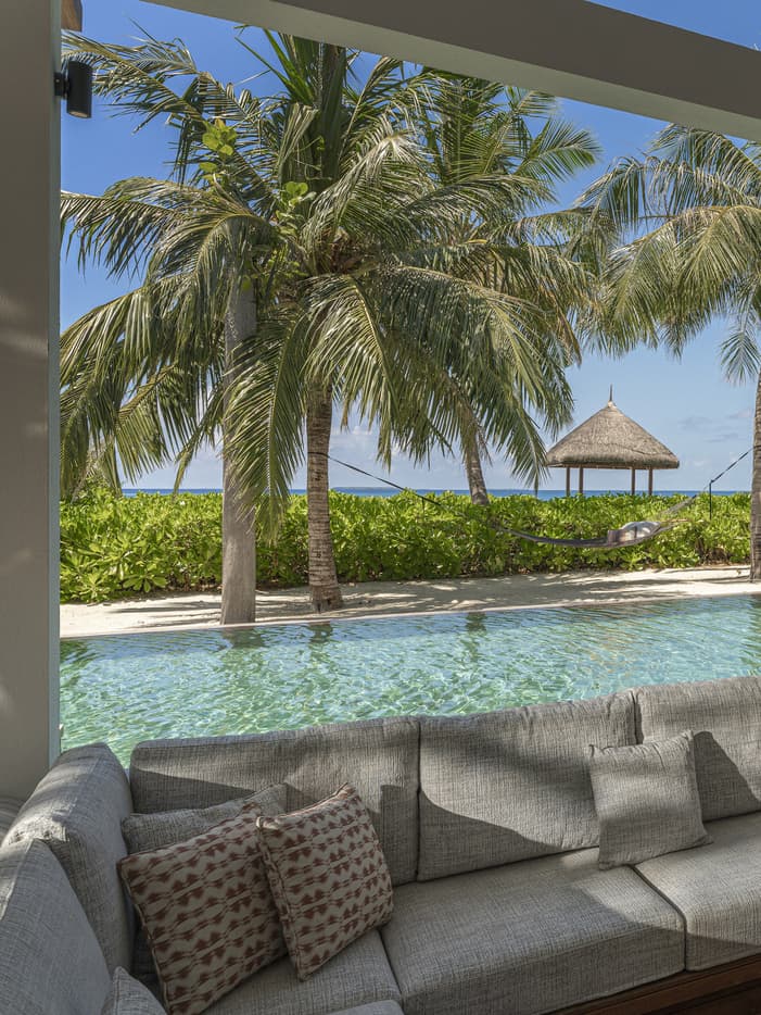这栋由三座亭楼组成的别墅围绕约 20 米长的泳池而立。泳池旁,中央露天休闲区、几张日光榻、“漂浮之岛”餐厅等设施一应俱全,私藏的白沙海滨风光美不胜收。这里的环境纯粹私密,离气氛热闹的 Blu 海滩俱乐部也仅数步之遥。