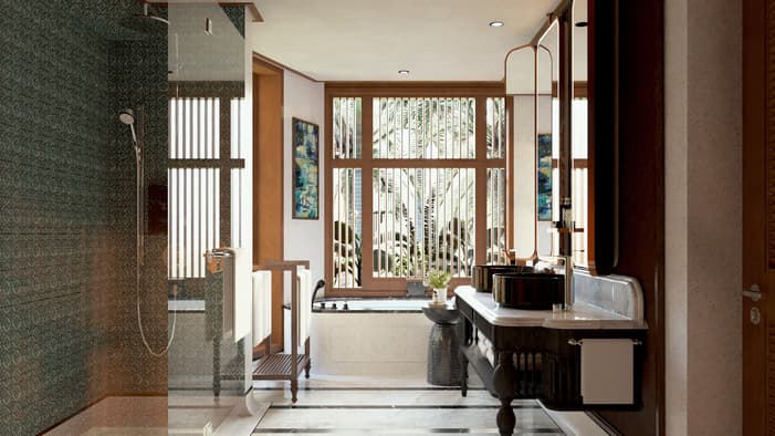 宽敞的浴室以水磨石瓷砖铺砌,配有双台盆、深浸式浴缸和独立淋浴间,让每一次洗浴都成为焕活身心的仪式。