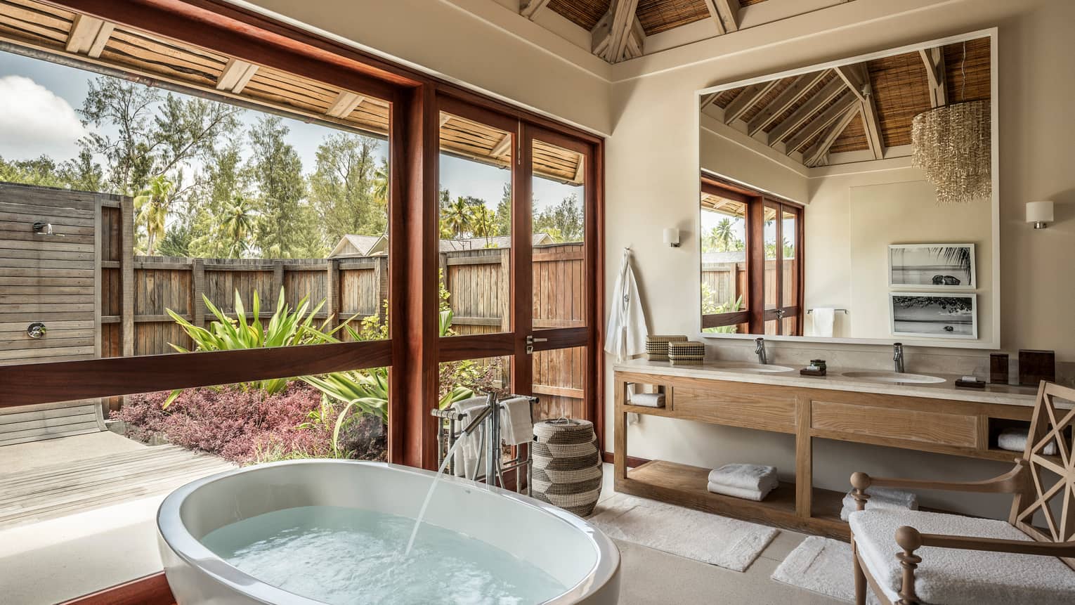 1 间设备齐全的浴室,配双人雨林淋浴间、独立深浸式浴缸和双台盆,此外还有室外淋浴间