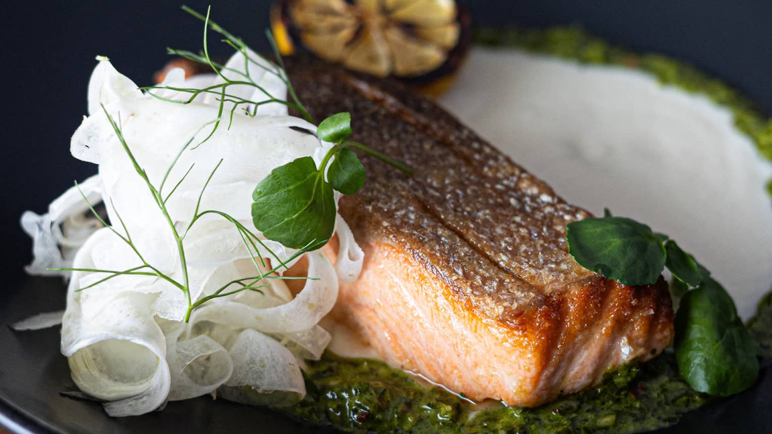 挪威三文鱼香煎配青芦笋、枝番茄、酸豆柠檬酱汁