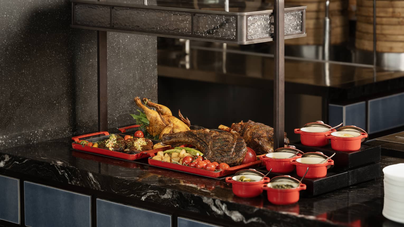福启新岁,欢飨云合,品鉴脆皮伊比利亚五花猪肉卷配5J火腿、火焰布丁、芝士焗龙虾派送、金汤海鲜汆石斑鱼、战斧牛排等特色佳肴,并畅享新年主题甜品台。每位人民币1188元。