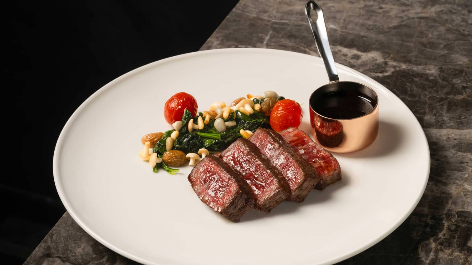 烤牛排Rangers Valley M3 - 4牛柳里脊肉(180克)嫩炒菠菜,烤樱桃番茄,搭配黑胡椒汁