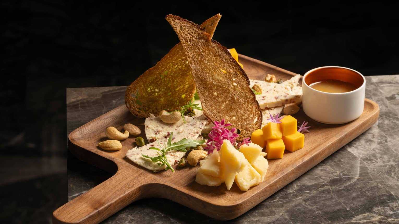 芝士拼盘烟熏切达芝士,温德利代尔蔓越莓芝士,帕玛森干酪(24个月)。配料:迷迭香蜂蜜,时令葡萄,混合坚果,烤酸面包