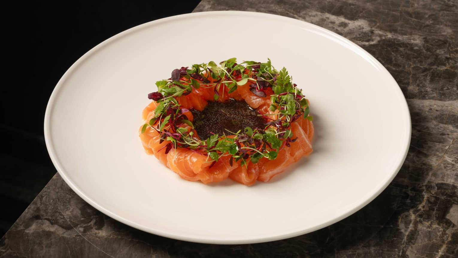 生切三文鱼薄片松露风味日式照烧,微型生菜沙拉