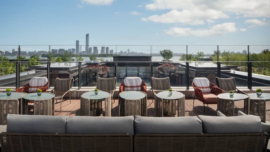户外露台步入挑高两层的开阔大堂酒廊,金鸡湖与城市天际线的全景风光尽收眼底 。超大户外露台可饱览酒店四周景观,欢享悠然时光。