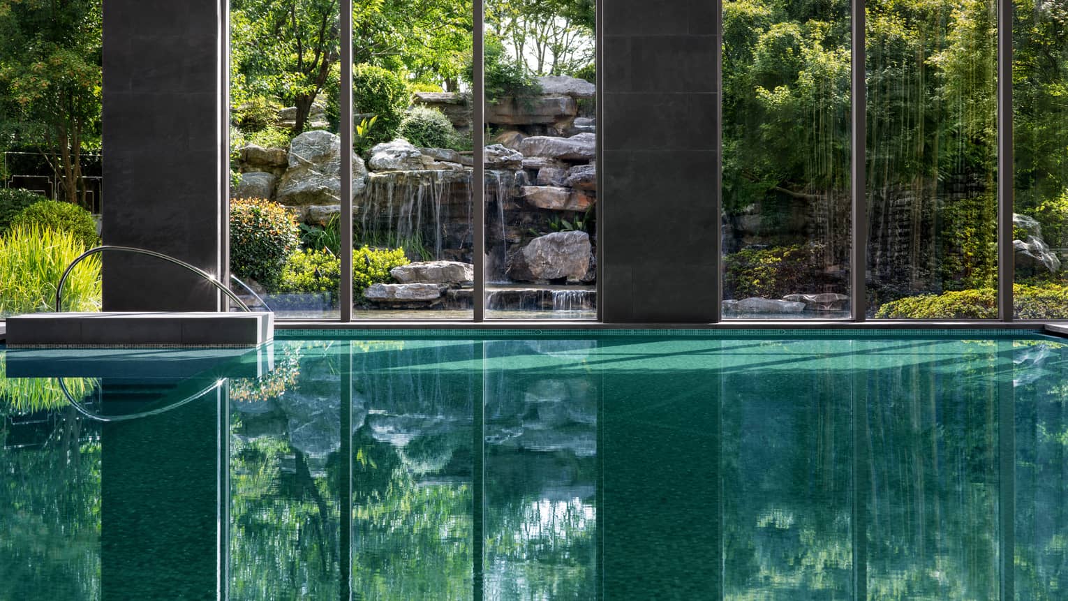 园景室内恒温泳池隐匿于葱郁绿意间的园景室内恒温泳池,是专属于您的水域谧境,全景落地玻璃将满园精心雕琢的繁茂景致尽数框入。