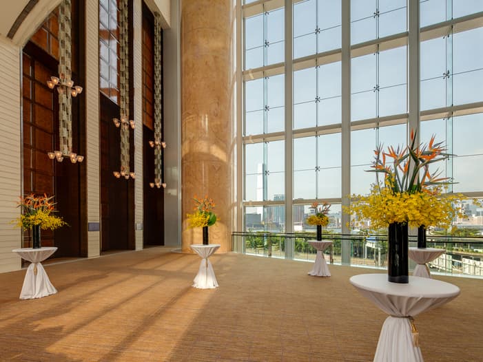 海景禮堂在位於四樓的海景禮堂舉辦活動,將維港和九龍的壯麗景緻盡收眼底。以大理石柱為框的落地大窗、玻璃鑲板天花板和金銀交織的吹製玻璃青銅吊燈,令這間禮堂顯得格外氣派非凡。